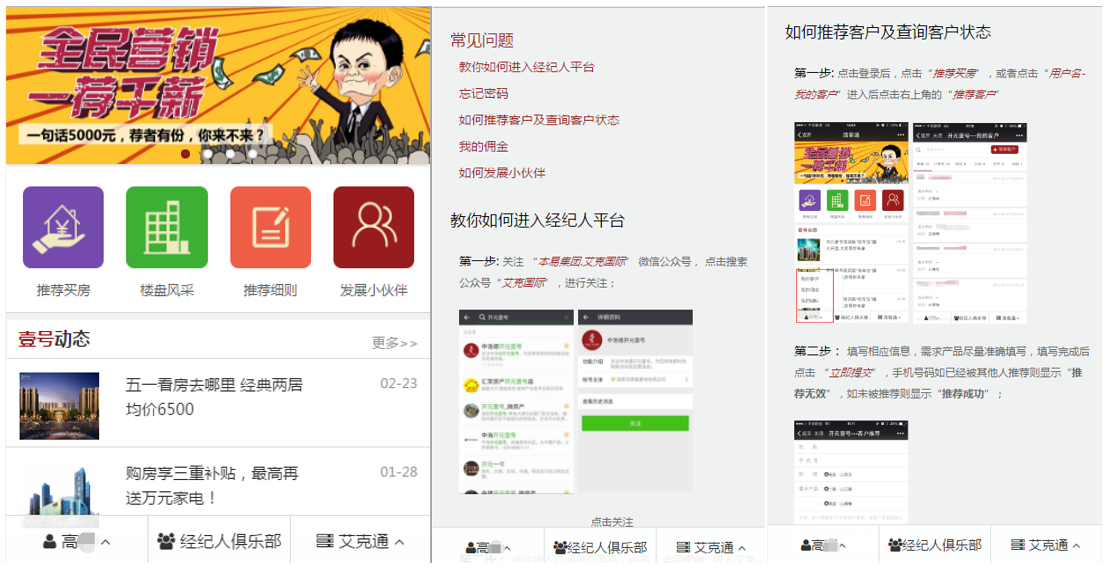 客戶注冊(cè):擁有微信并關(guān)注公眾號(hào),即可注冊(cè)申請(qǐng)成為全民營(yíng)銷系統(tǒng)的用戶(全民經(jīng)紀(jì)人)。注冊(cè)用戶可隨時(shí)通過(guò)微信查看已經(jīng)推薦的客戶信息、購(gòu)房進(jìn)度、傭金結(jié)算情況。